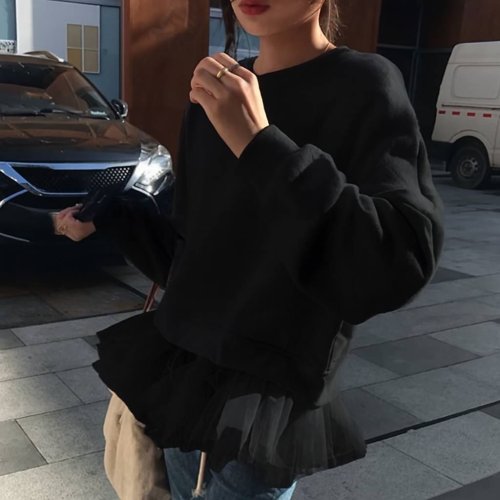Kadın uzun kollu bisiklet yaka tül volan detay üç iplik sweat