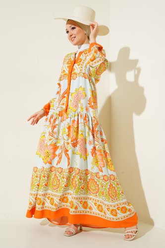 • 2423 Otantik Desenli Tesettür Elbise YTuruncu