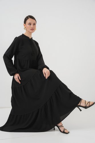 • T1627 Yaka Bağcıklı Elbise Siyah