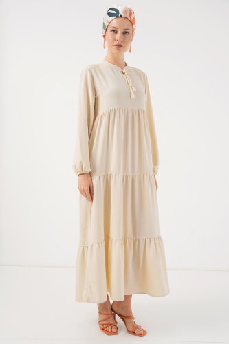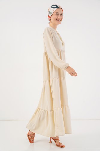 • 1627 Yaka Bağcıklı Tesettür Elbise Krem