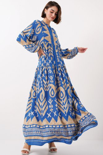 • 2423 Otantik Desenli Tesettür Elbise FMavi