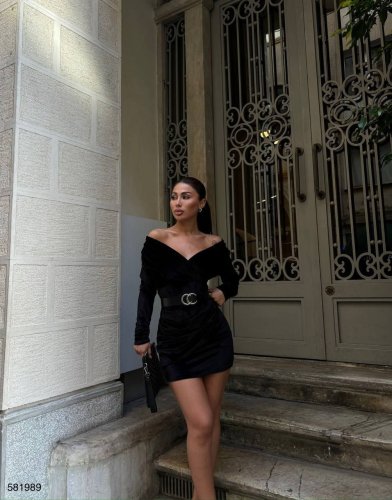 • Kadın uzun kollu kruvaze yaka omuz dekolteli kemer dahil mini kadife elbise
