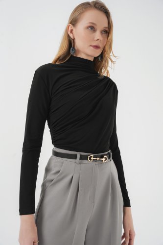 925 Büzgü Detaylı Sandy Bluz Siyah
