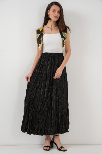 Uzun Kırışık Parlak Etek 8034 Siyah